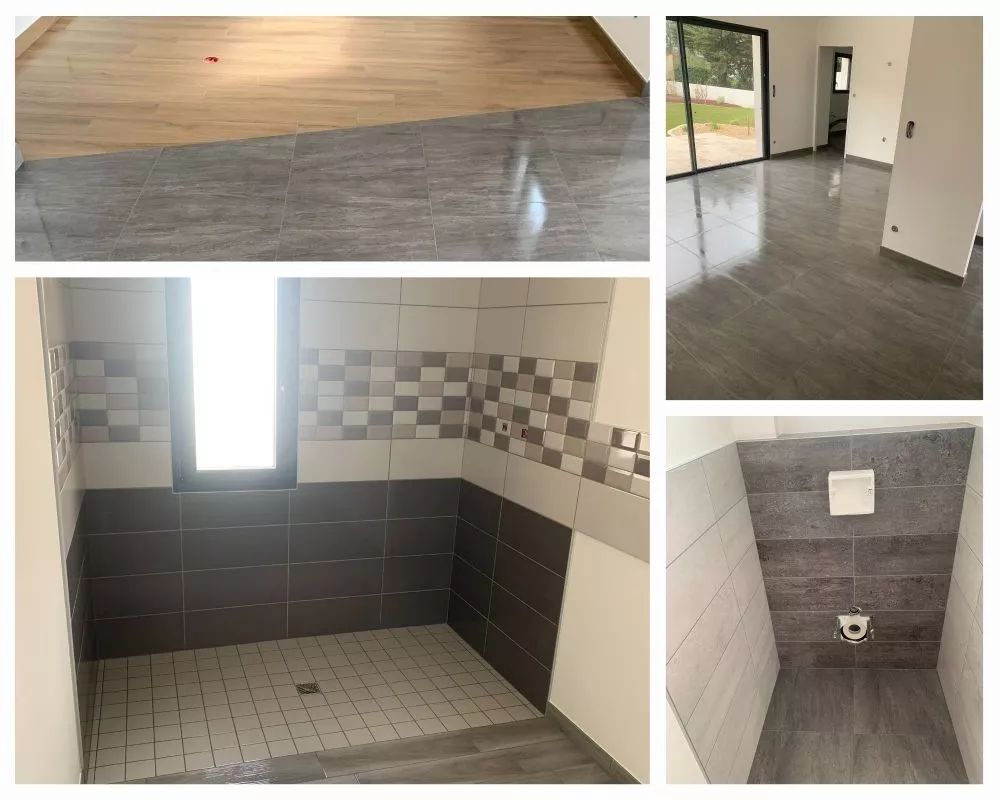 Mélange très réussi de carrelage imitation bois et 45x45 taupe